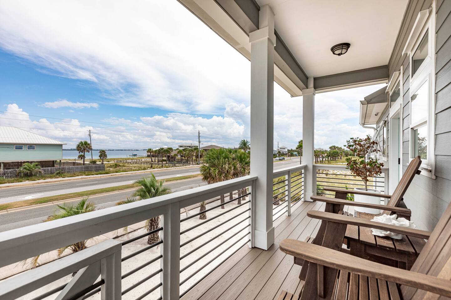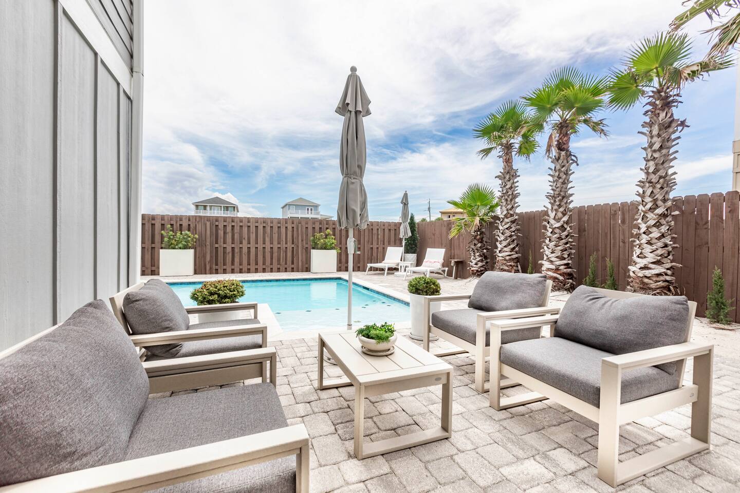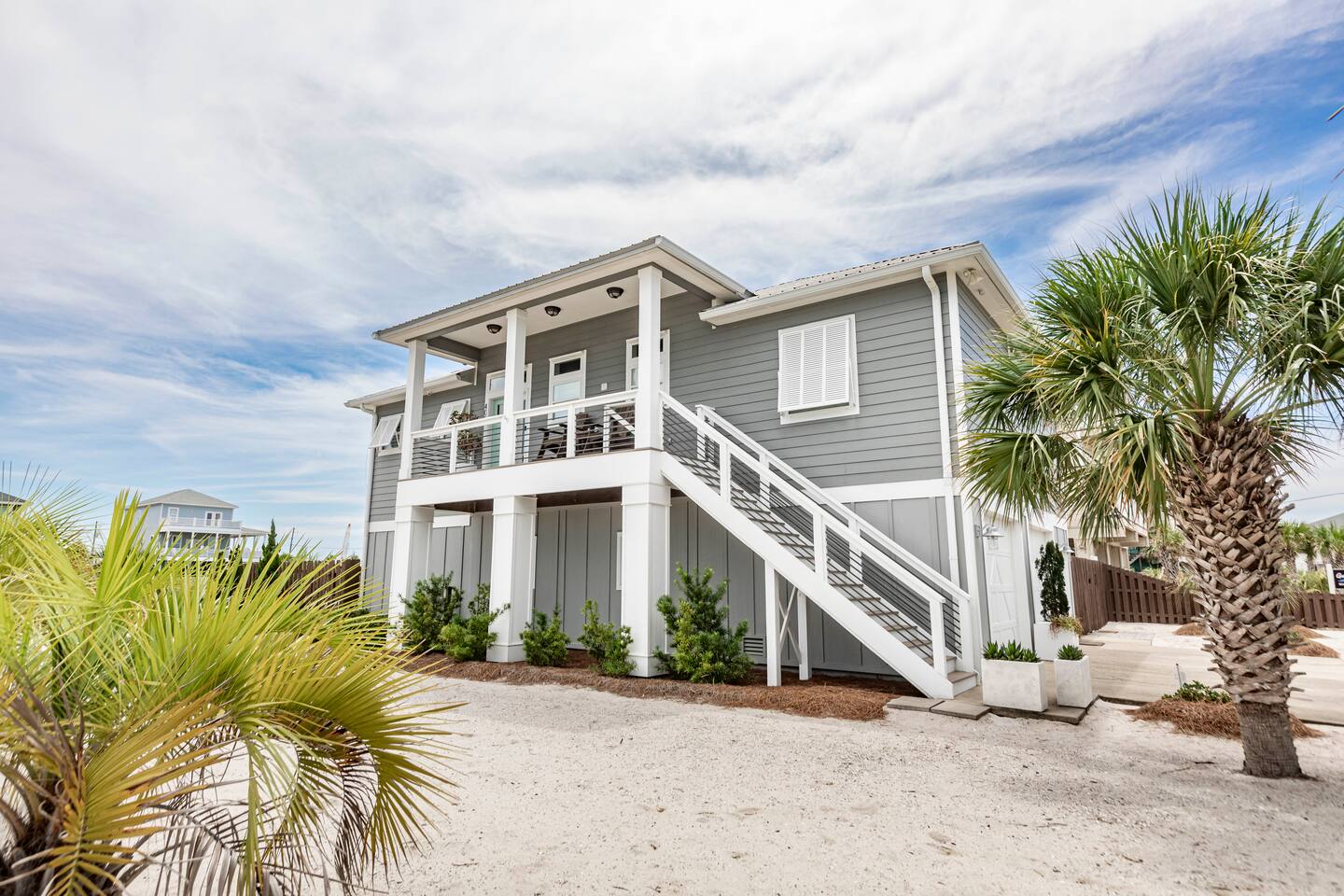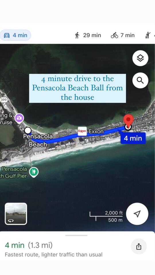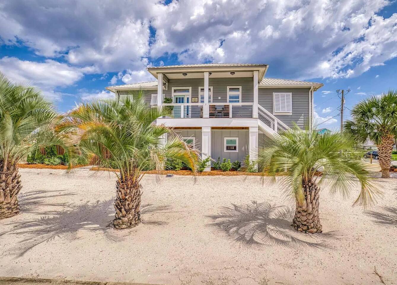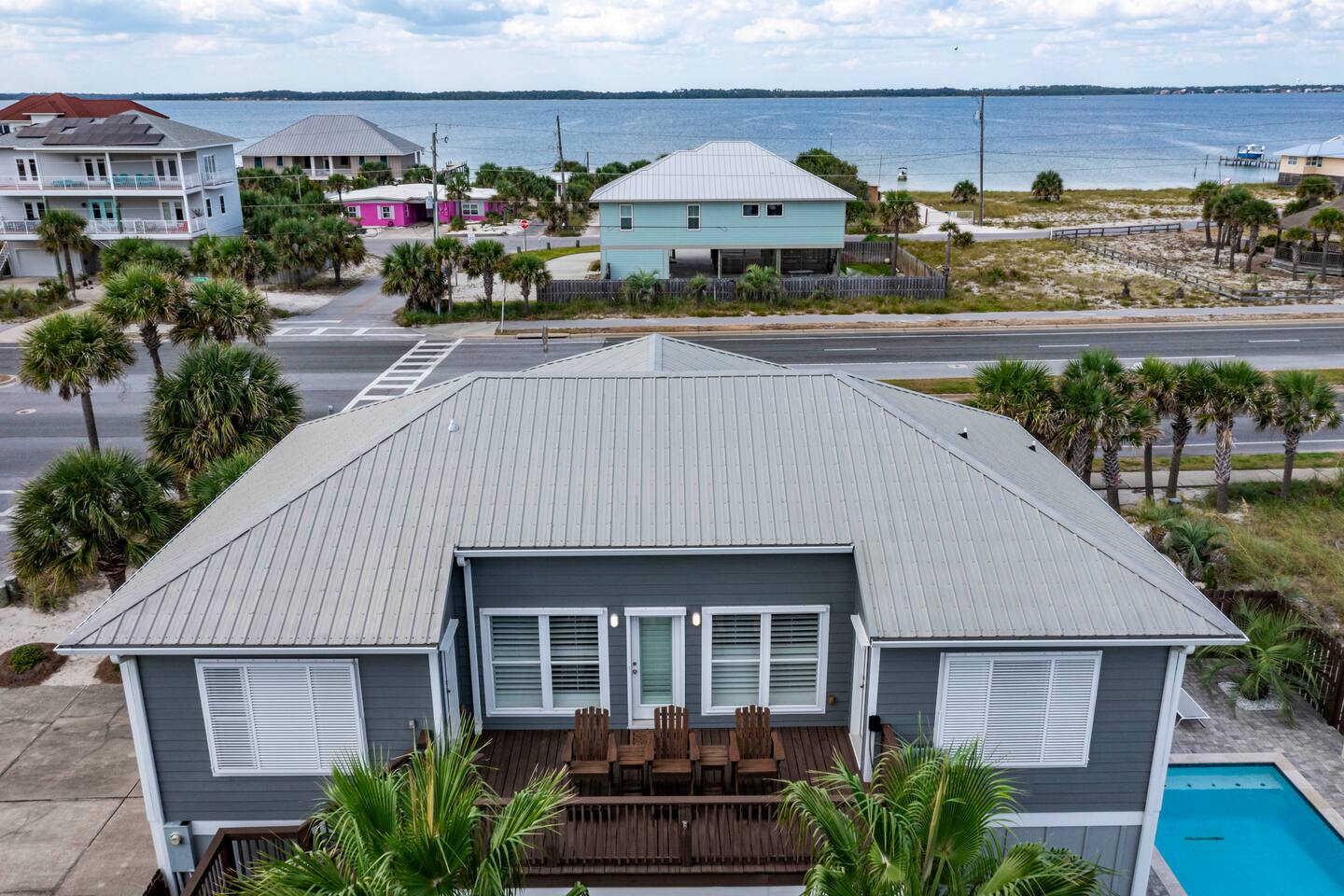You will love our beautiful coastal home design and our gorgeous saltwater pool! Home is beautifully furnished with high end, unique coastal furniture pieces and decor inspired by and curated from both 30A as well as locally here in Pensacola. Each bedroom sleeps two and house sleeps up to 14 guests. King size pillow top mattress in the primary suite upstairs. Two other bedrooms upstairs with queen pillow top mattresses and jack-n-jill bathroom between. Queen Sleeper sofa in living room. Bunkroom downstairs with two queen over queen bunks. (Outside entrance only. No interior staircase. Entrance is under the back deck by the pool within the privacy fence. Hotel luxury 600 thread count, soft sheets and bedding. Two and a half full bathrooms upstairs and one full bath downstairs by the pool. Smart TVs so you can log in to your own accounts and watch your movies while on vacation. Various reading books, family games, cards and more throughout the home. Wifi provided. We love the house as it sits on one of the narrowest parts of the island and you can see BOTH bodies of water - Views of the Gulf out the back windows and views of the sound off the front porch. Three minute walk to the beach access and five minute walk over to the sound. This home is in the perfect location on the beach side of the island. It is just off of the main beach road, so quick to head down to restaurants and shopping. Enjoy the complementary Pensacola Beach Trolleys from Memorial Day through Labor Day that stops in front of the home and will take you up and down to all the restaurants. Or rent our 4 seater golf cart for an EXTRA FEE of 75/night. Fully stocked with all your BEACH gear! Beach chairs, paddle board, skimboards, boogie boards, beach sand toys, umbrella, beach towels and floats all available for your stay. Cornhole and spikeball for even more fun! Just bring your swimsuit! Kitchen has everything you'd need for your stay including Keurig, coffee maker and a Ninja cocktail blender, crock pot and fish fryer. Weber charcoal grill provided (bring your own charcoal). Extra drink fridge downstairs for all of your beach drinks. Washer Dryer access in the home. (bring your own detergent) Starter pack of paper towel roll, 2 rolls of toilet paper, 2 dish pods, 2 trash bags, and hand soap will be provided for your stay! We have a couple box fans in the house if you can't sleep without one. iykyk