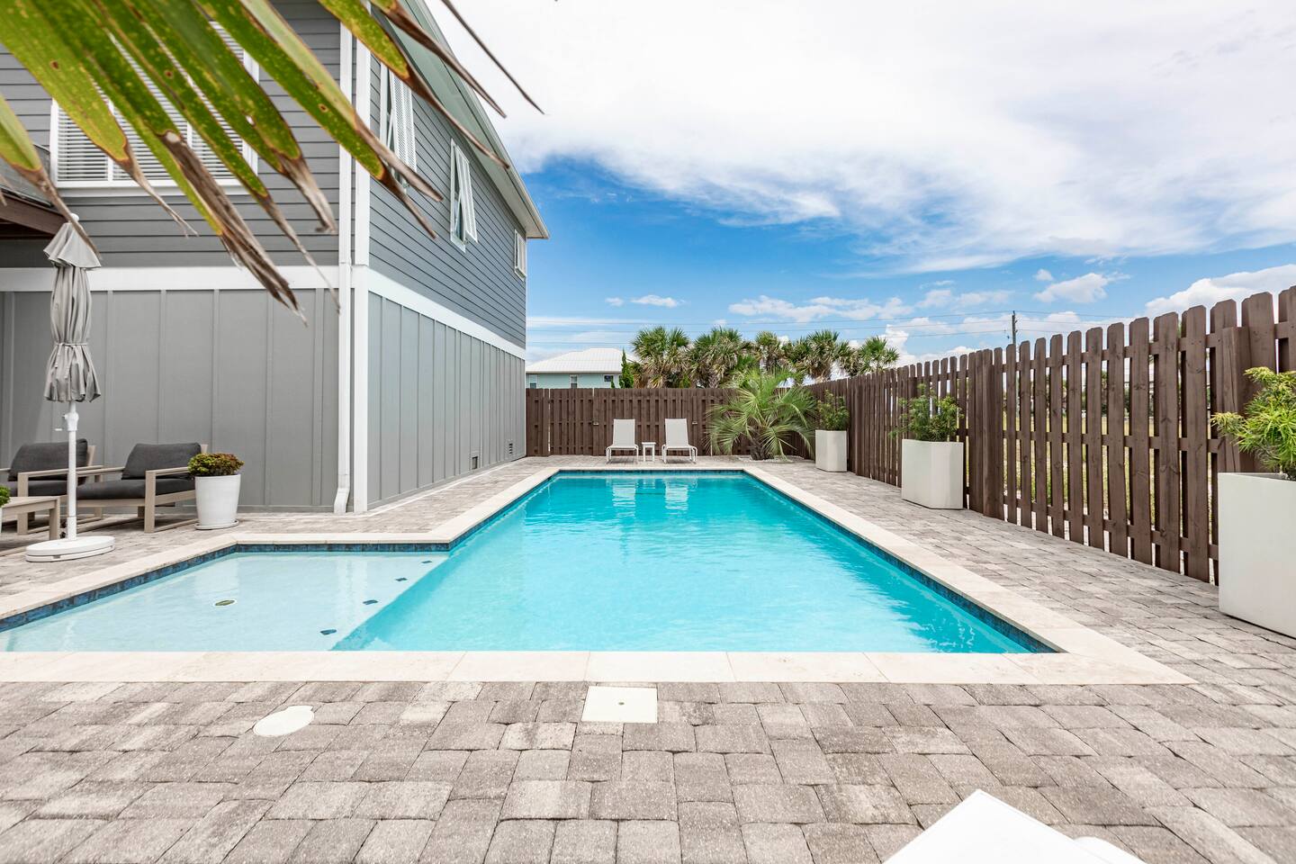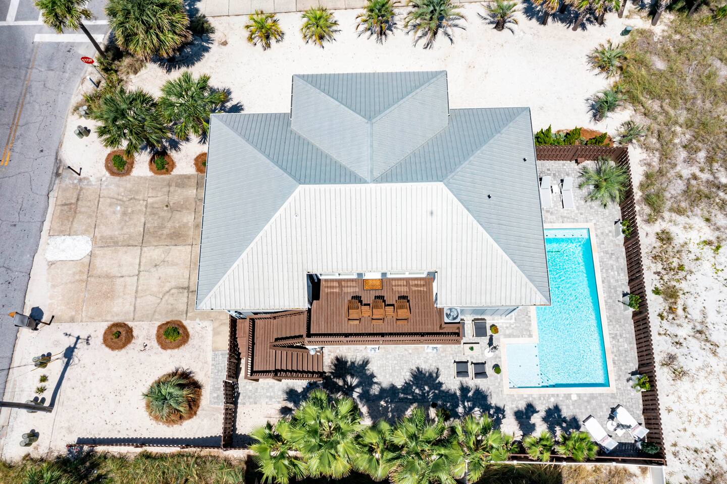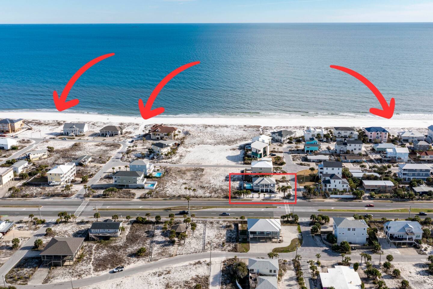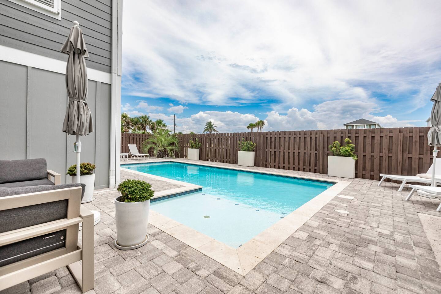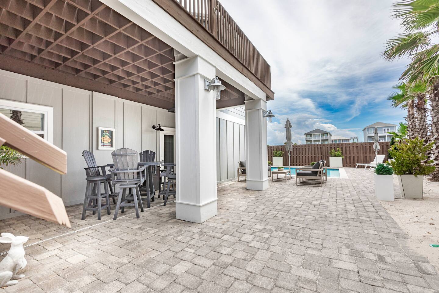 You will love our beautiful coastal home design and our gorgeous saltwater pool! Home is beautifully furnished with high end, unique coastal furniture pieces and decor inspired by and curated from both 30A as well as locally here in Pensacola. Each bedroom sleeps two and house sleeps up to 14 guests. King size pillow top mattress in the primary suite upstairs. Two other bedrooms upstairs with queen pillow top mattresses and jack-n-jill bathroom between. Queen Sleeper sofa in living room. Bunkroom downstairs with two queen over queen bunks. (Outside entrance only. No interior staircase. Entrance is under the back deck by the pool within the privacy fence. Hotel luxury 600 thread count, soft sheets and bedding. Two and a half full bathrooms upstairs and one full bath downstairs by the pool. Smart TVs so you can log in to your own accounts and watch your movies while on vacation. Various reading books, family games, cards and more throughout the home. Wifi provided. We love the house as it sits on one of the narrowest parts of the island and you can see BOTH bodies of water - Views of the Gulf out the back windows and views of the sound off the front porch. Three minute walk to the beach access and five minute walk over to the sound. This home is in the perfect location on the beach side of the island. It is just off of the main beach road, so quick to head down to restaurants and shopping. Enjoy the complementary Pensacola Beach Trolleys from Memorial Day through Labor Day that stops in front of the home and will take you up and down to all the restaurants. Or rent our 4 seater golf cart for an EXTRA FEE of 75/night. Fully stocked with all your BEACH gear! Beach chairs, paddle board, skimboards, boogie boards, beach sand toys, umbrella, beach towels and floats all available for your stay. Cornhole and spikeball for even more fun! Just bring your swimsuit! Kitchen has everything you'd need for your stay including Keurig, coffee maker and a Ninja cocktail blender, crock pot and fish fryer. Weber charcoal grill provided (bring your own charcoal). Extra drink fridge downstairs for all of your beach drinks. Washer Dryer access in the home. (bring your own detergent) Starter pack of paper towel roll, 2 rolls of toilet paper, 2 dish pods, 2 trash bags, and hand soap will be provided for your stay! We have a couple box fans in the house if you can't sleep without one. iykyk