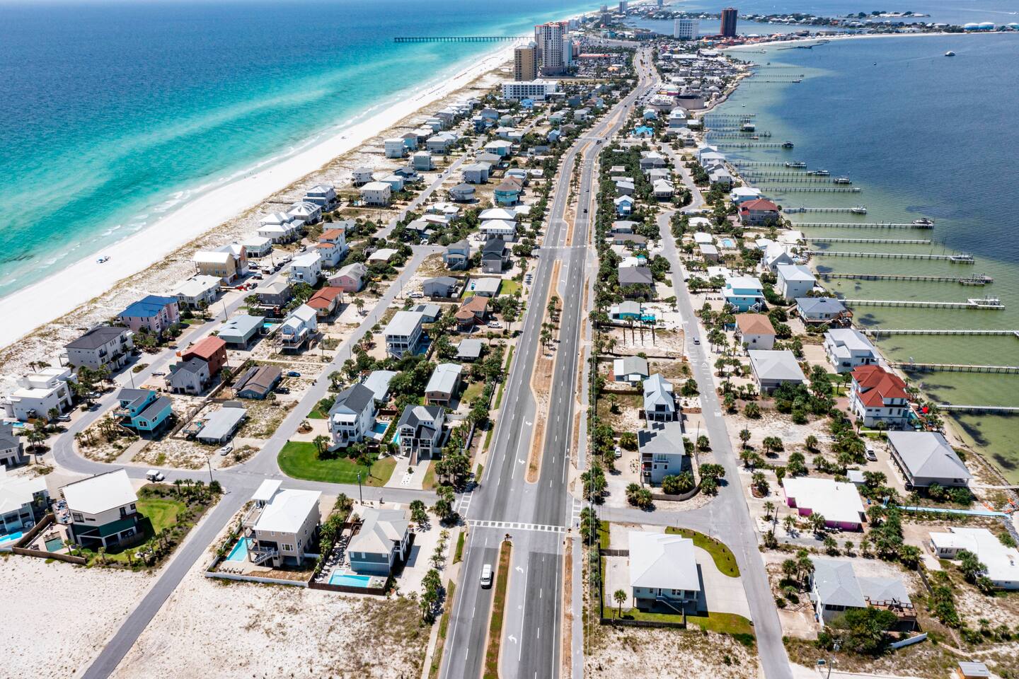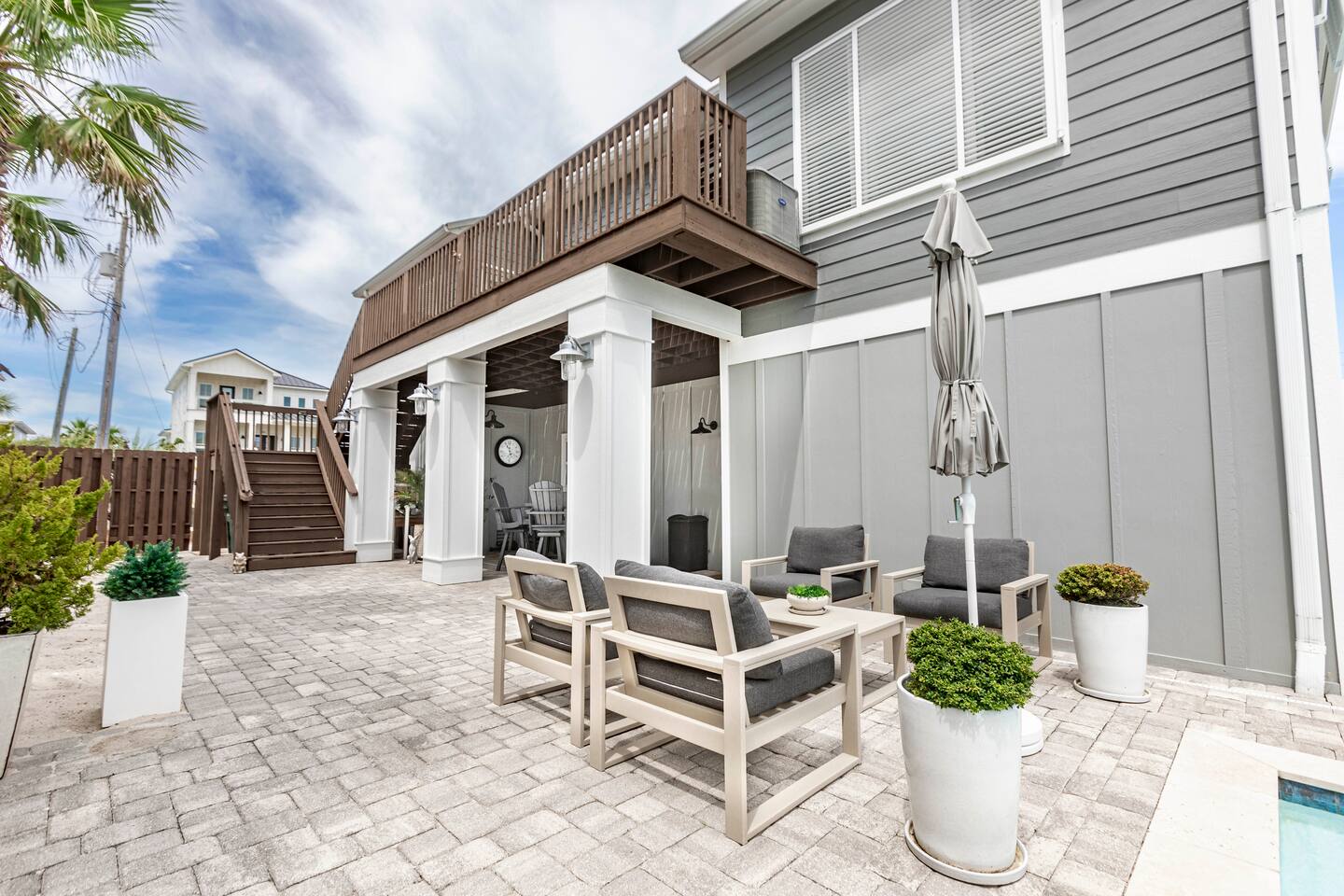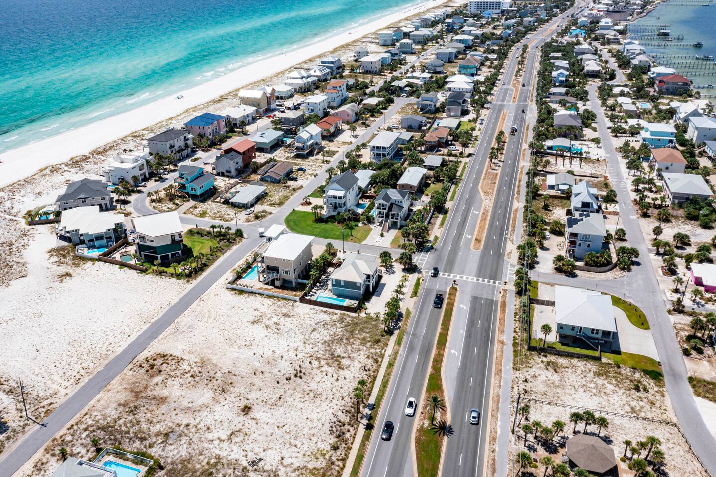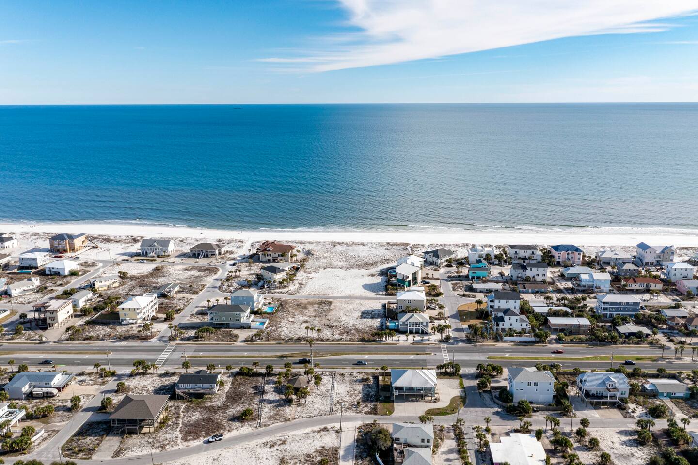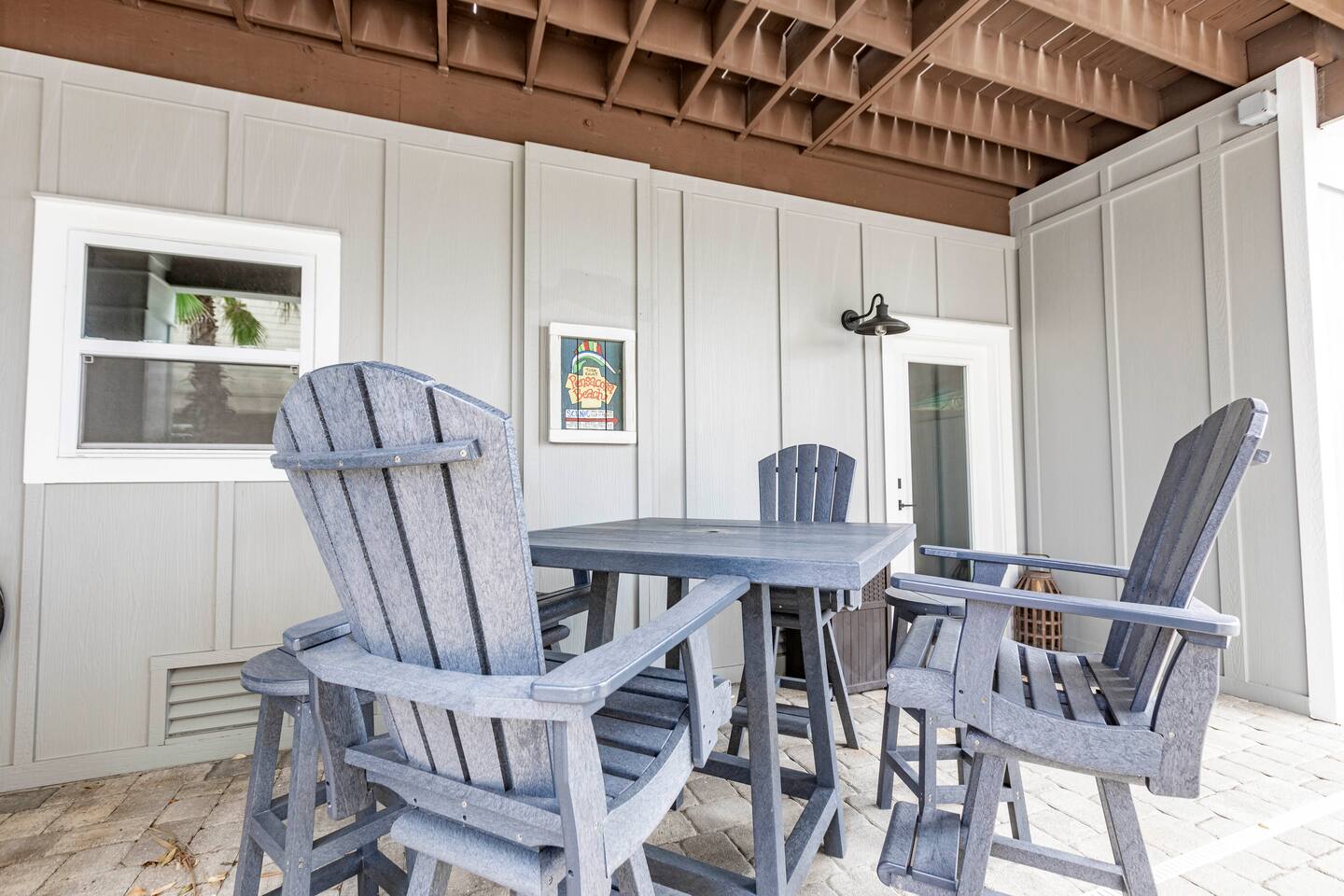 You will love our beautiful coastal home design and our gorgeous saltwater pool! Home is beautifully furnished with high end, unique coastal furniture pieces and decor inspired by and curated from both 30A as well as locally here in Pensacola. Each bedroom sleeps two and house sleeps up to 14 guests. King size pillow top mattress in the primary suite upstairs. Two other bedrooms upstairs with queen pillow top mattresses and jack-n-jill bathroom between. Queen Sleeper sofa in living room. Bunkroom downstairs with two queen over queen bunks. (Outside entrance only. No interior staircase. Entrance is under the back deck by the pool within the privacy fence. Hotel luxury 600 thread count, soft sheets and bedding. Two and a half full bathrooms upstairs and one full bath downstairs by the pool. Smart TVs so you can log in to your own accounts and watch your movies while on vacation. Various reading books, family games, cards and more throughout the home. Wifi provided. We love the house as it sits on one of the narrowest parts of the island and you can see BOTH bodies of water - Views of the Gulf out the back windows and views of the sound off the front porch. Three minute walk to the beach access and five minute walk over to the sound. This home is in the perfect location on the beach side of the island. It is just off of the main beach road, so quick to head down to restaurants and shopping. Enjoy the complementary Pensacola Beach Trolleys from Memorial Day through Labor Day that stops in front of the home and will take you up and down to all the restaurants. Or rent our 4 seater golf cart for an EXTRA FEE of 75/night. Fully stocked with all your BEACH gear! Beach chairs, paddle board, skimboards, boogie boards, beach sand toys, umbrella, beach towels and floats all available for your stay. Cornhole and spikeball for even more fun! Just bring your swimsuit! Kitchen has everything you'd need for your stay including Keurig, coffee maker and a Ninja cocktail blender, crock pot and fish fryer. Weber charcoal grill provided (bring your own charcoal). Extra drink fridge downstairs for all of your beach drinks. Washer Dryer access in the home. (bring your own detergent) Starter pack of paper towel roll, 2 rolls of toilet paper, 2 dish pods, 2 trash bags, and hand soap will be provided for your stay! We have a couple box fans in the house if you can't sleep without one. iykyk