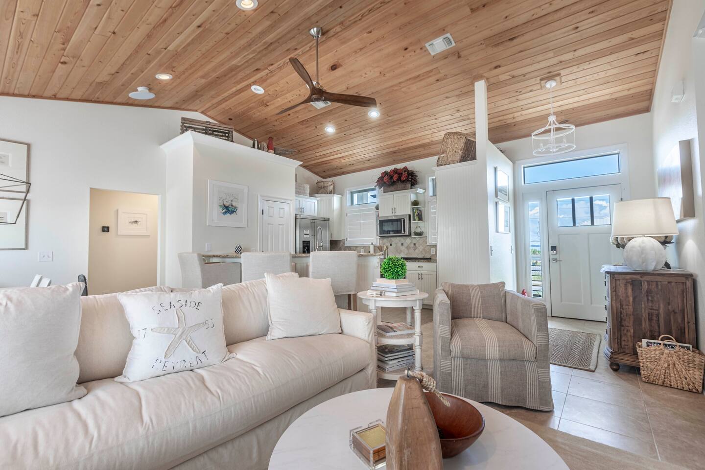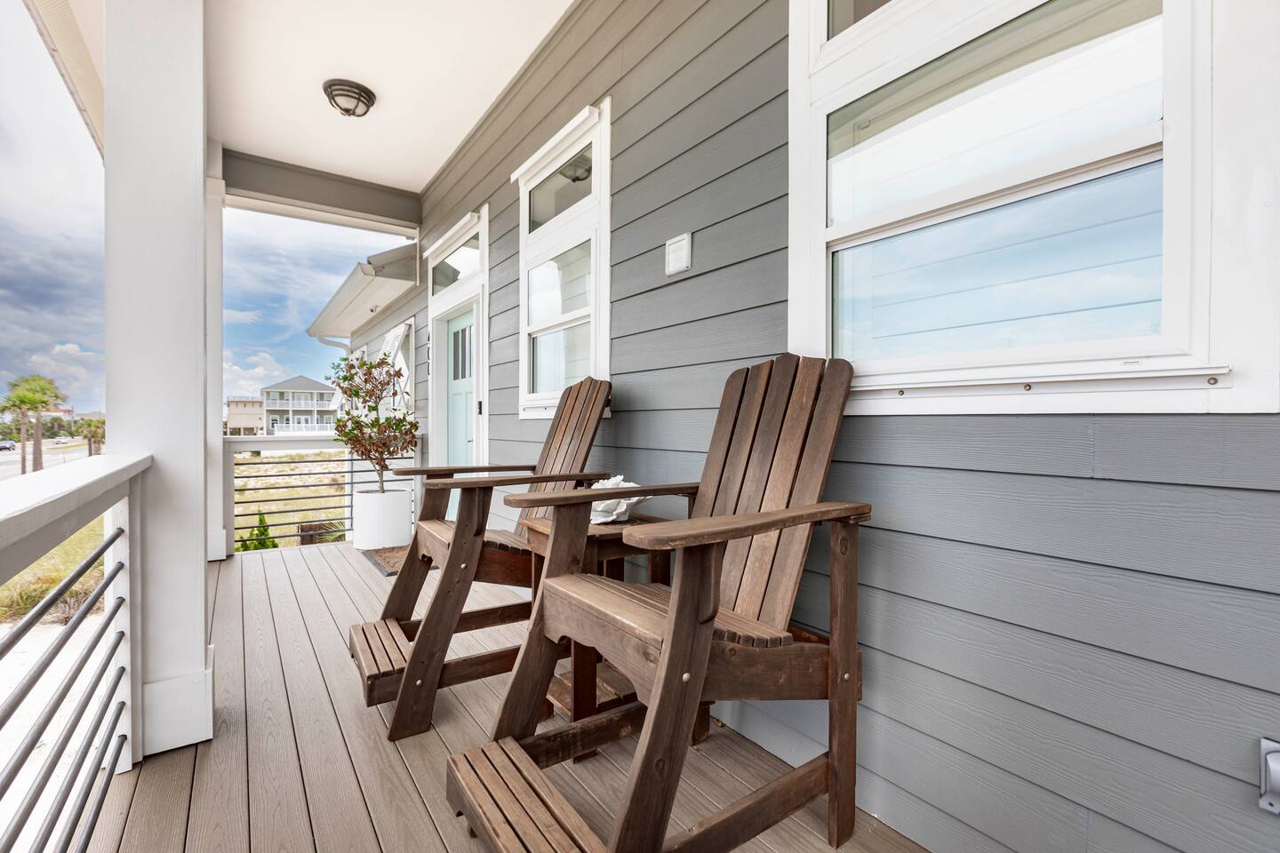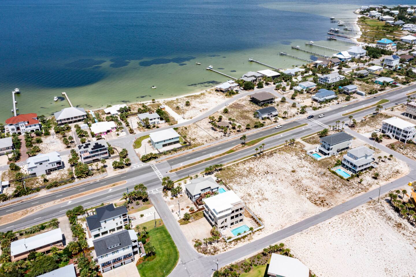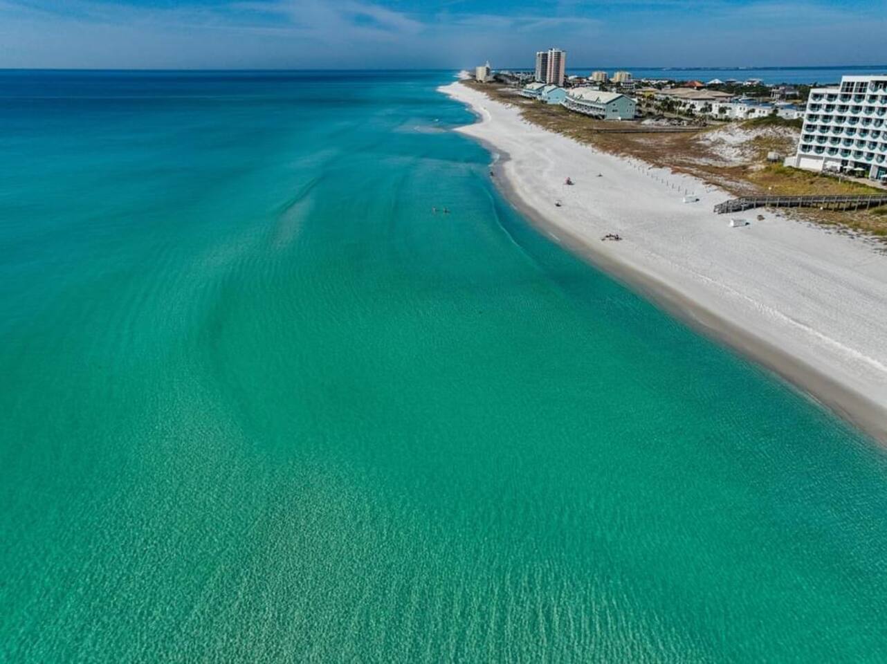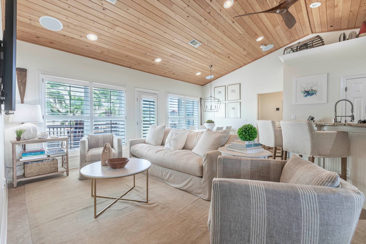 You will love our beautiful coastal home design and our gorgeous saltwater pool! Home is beautifully furnished with high end, unique coastal furniture pieces and decor inspired by and curated from both 30A as well as locally here in Pensacola. Each bedroom sleeps two and house sleeps up to 14 guests. King size pillow top mattress in the primary suite upstairs. Two other bedrooms upstairs with queen pillow top mattresses and jack-n-jill bathroom between. Queen Sleeper sofa in living room. Bunkroom downstairs with two queen over queen bunks. (Outside entrance only. No interior staircase. Entrance is under the back deck by the pool within the privacy fence. Hotel luxury 600 thread count, soft sheets and bedding. Two and a half full bathrooms upstairs and one full bath downstairs by the pool. Smart TVs so you can log in to your own accounts and watch your movies while on vacation. Various reading books, family games, cards and more throughout the home. Wifi provided. We love the house as it sits on one of the narrowest parts of the island and you can see BOTH bodies of water - Views of the Gulf out the back windows and views of the sound off the front porch. Three minute walk to the beach access and five minute walk over to the sound. This home is in the perfect location on the beach side of the island. It is just off of the main beach road, so quick to head down to restaurants and shopping. Enjoy the complementary Pensacola Beach Trolleys from Memorial Day through Labor Day that stops in front of the home and will take you up and down to all the restaurants. Or rent our 4 seater golf cart for an EXTRA FEE of 75/night. Fully stocked with all your BEACH gear! Beach chairs, paddle board, skimboards, boogie boards, beach sand toys, umbrella, beach towels and floats all available for your stay. Cornhole and spikeball for even more fun! Just bring your swimsuit! Kitchen has everything you'd need for your stay including Keurig, coffee maker and a Ninja cocktail blender, crock pot and fish fryer. Weber charcoal grill provided (bring your own charcoal). Extra drink fridge downstairs for all of your beach drinks. Washer Dryer access in the home. (bring your own detergent) Starter pack of paper towel roll, 2 rolls of toilet paper, 2 dish pods, 2 trash bags, and hand soap will be provided for your stay! We have a couple box fans in the house if you can't sleep without one. iykyk
