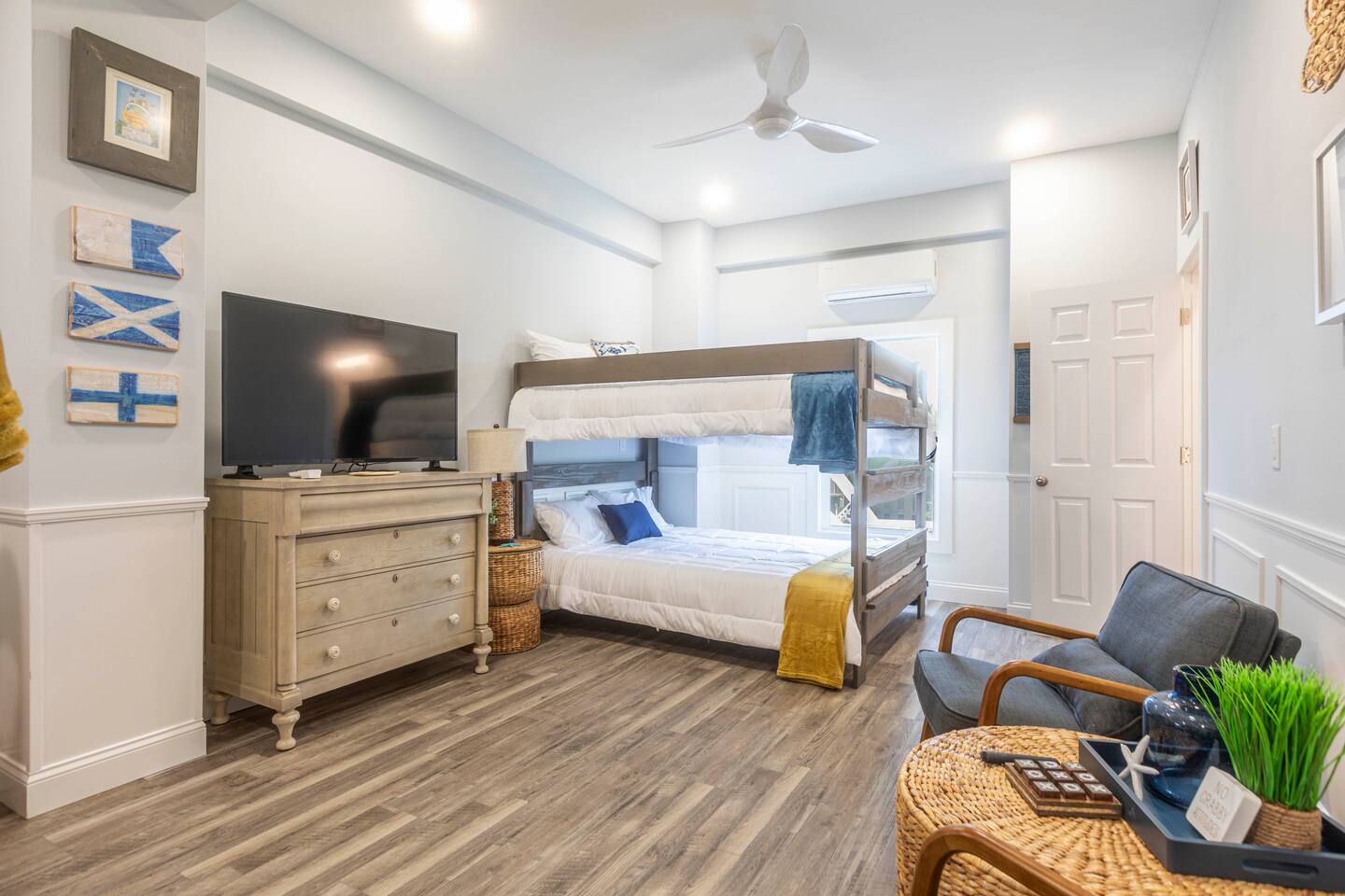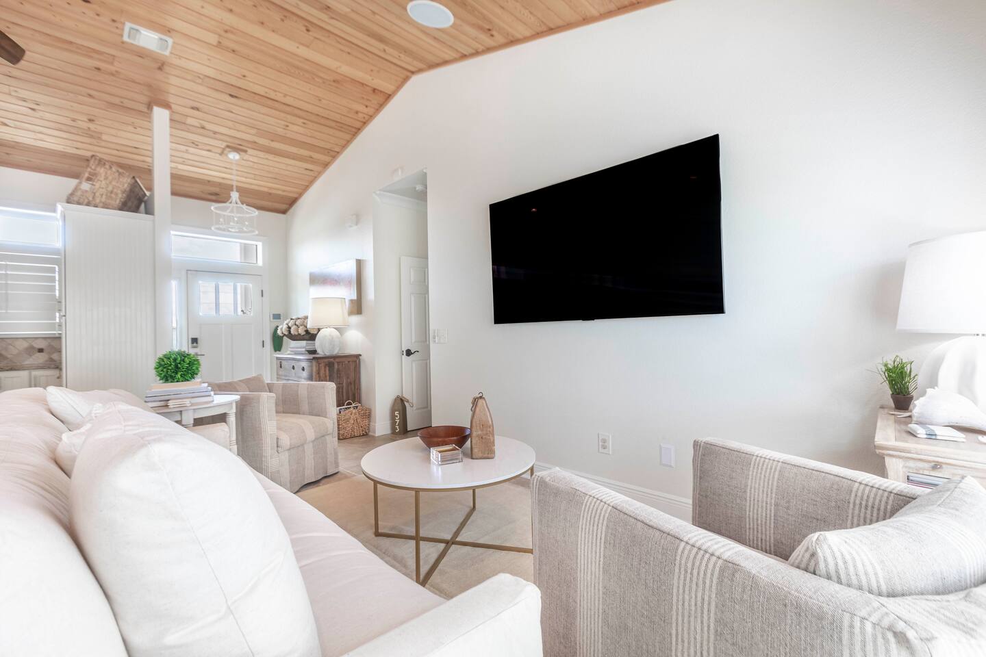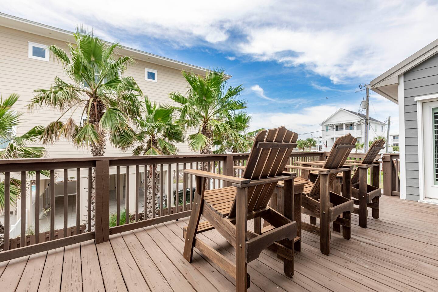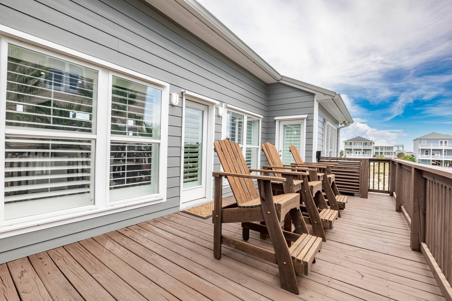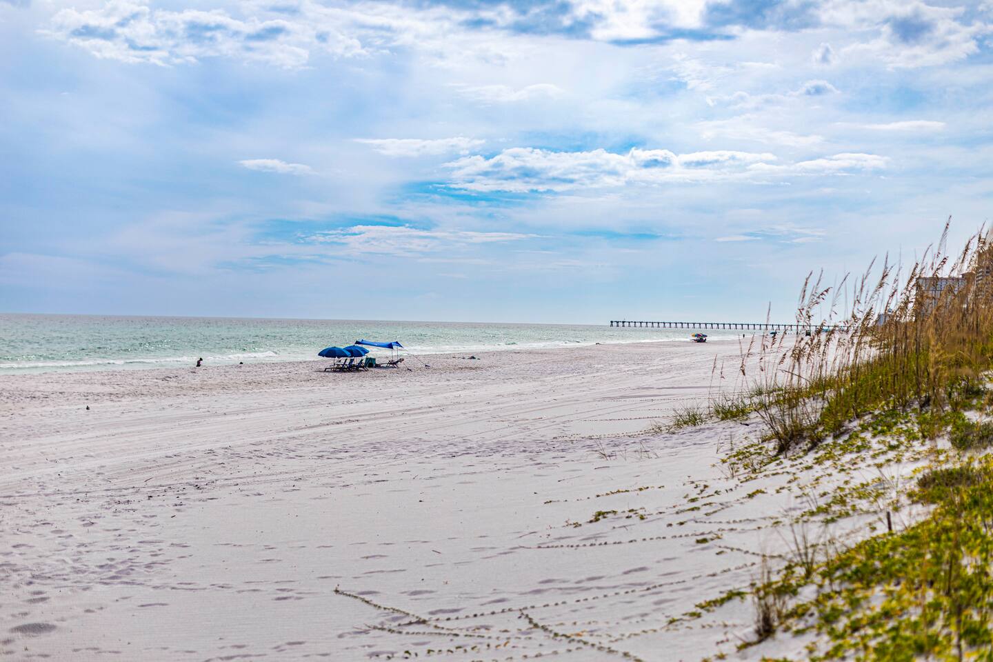 You will love our beautiful coastal home design and our gorgeous saltwater pool! Home is beautifully furnished with high end, unique coastal furniture pieces and decor inspired by and curated from both 30A as well as locally here in Pensacola. Each bedroom sleeps two and house sleeps up to 14 guests. King size pillow top mattress in the primary suite upstairs. Two other bedrooms upstairs with queen pillow top mattresses and jack-n-jill bathroom between. Queen Sleeper sofa in living room. Bunkroom downstairs with two queen over queen bunks. (Outside entrance only. No interior staircase. Entrance is under the back deck by the pool within the privacy fence. Hotel luxury 600 thread count, soft sheets and bedding. Two and a half full bathrooms upstairs and one full bath downstairs by the pool. Smart TVs so you can log in to your own accounts and watch your movies while on vacation. Various reading books, family games, cards and more throughout the home. Wifi provided. We love the house as it sits on one of the narrowest parts of the island and you can see BOTH bodies of water - Views of the Gulf out the back windows and views of the sound off the front porch. Three minute walk to the beach access and five minute walk over to the sound. This home is in the perfect location on the beach side of the island. It is just off of the main beach road, so quick to head down to restaurants and shopping. Enjoy the complementary Pensacola Beach Trolleys from Memorial Day through Labor Day that stops in front of the home and will take you up and down to all the restaurants. Or rent our 4 seater golf cart for an EXTRA FEE of 75/night. Fully stocked with all your BEACH gear! Beach chairs, paddle board, skimboards, boogie boards, beach sand toys, umbrella, beach towels and floats all available for your stay. Cornhole and spikeball for even more fun! Just bring your swimsuit! Kitchen has everything you'd need for your stay including Keurig, coffee maker and a Ninja cocktail blender, crock pot and fish fryer. Weber charcoal grill provided (bring your own charcoal). Extra drink fridge downstairs for all of your beach drinks. Washer Dryer access in the home. (bring your own detergent) Starter pack of paper towel roll, 2 rolls of toilet paper, 2 dish pods, 2 trash bags, and hand soap will be provided for your stay! We have a couple box fans in the house if you can't sleep without one. iykyk
