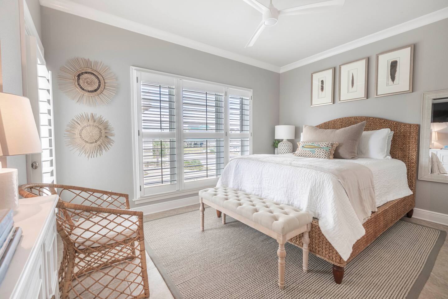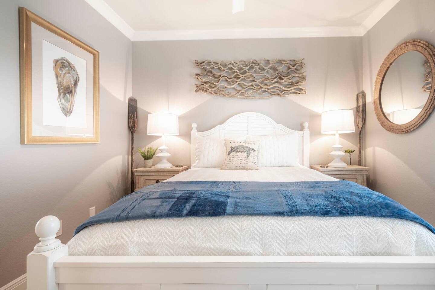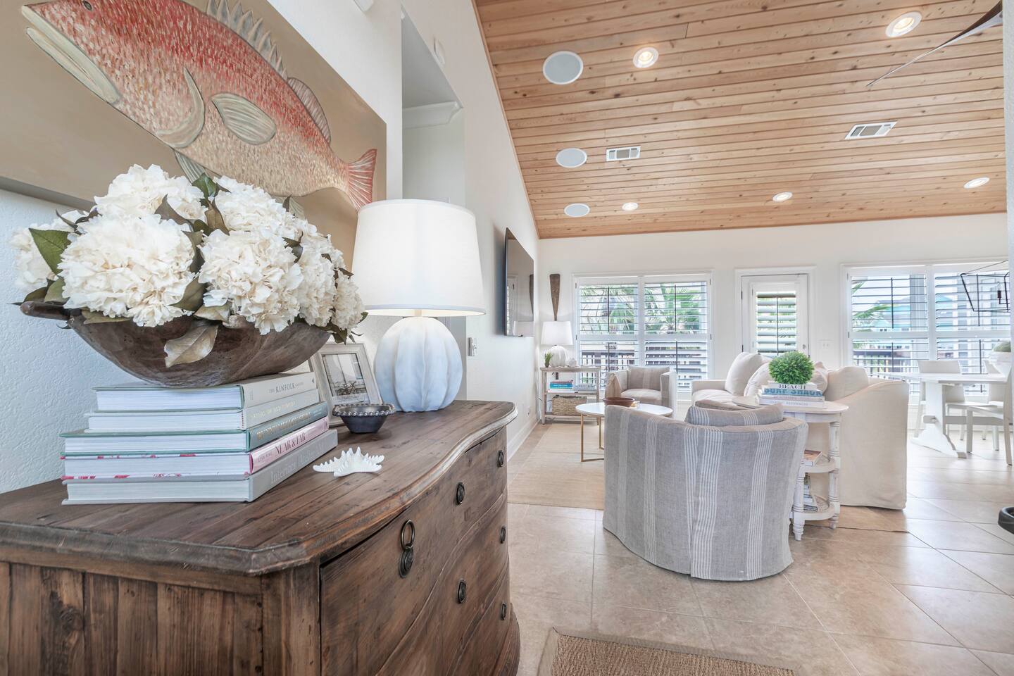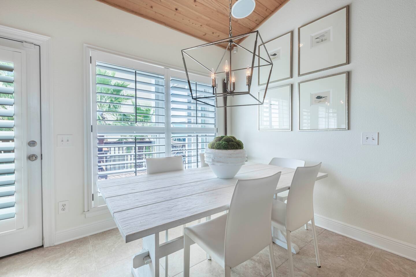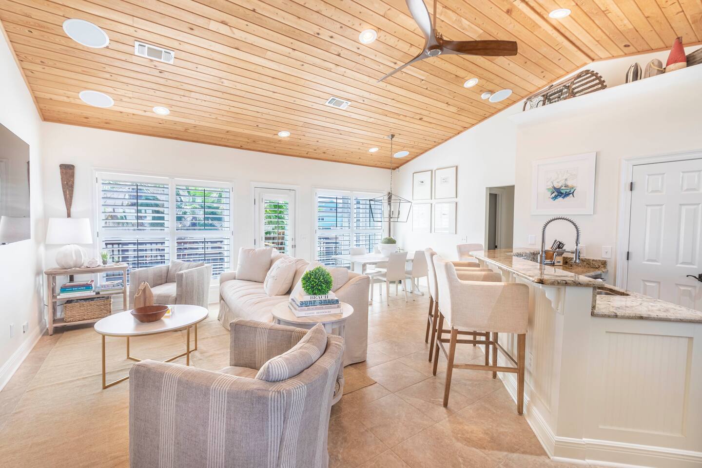 You will love our beautiful coastal home design and our gorgeous saltwater pool! Home is beautifully furnished with high end, unique coastal furniture pieces and decor inspired by and curated from both 30A as well as locally here in Pensacola. Each bedroom sleeps two and house sleeps up to 14 guests. King size pillow top mattress in the primary suite upstairs. Two other bedrooms upstairs with queen pillow top mattresses and jack-n-jill bathroom between. Queen Sleeper sofa in living room. Bunkroom downstairs with two queen over queen bunks. (Outside entrance only. No interior staircase. Entrance is under the back deck by the pool within the privacy fence. Hotel luxury 600 thread count, soft sheets and bedding. Two and a half full bathrooms upstairs and one full bath downstairs by the pool. Smart TVs so you can log in to your own accounts and watch your movies while on vacation. Various reading books, family games, cards and more throughout the home. Wifi provided. We love the house as it sits on one of the narrowest parts of the island and you can see BOTH bodies of water - Views of the Gulf out the back windows and views of the sound off the front porch. Three minute walk to the beach access and five minute walk over to the sound. This home is in the perfect location on the beach side of the island. It is just off of the main beach road, so quick to head down to restaurants and shopping. Enjoy the complementary Pensacola Beach Trolleys from Memorial Day through Labor Day that stops in front of the home and will take you up and down to all the restaurants. Or rent our 4 seater golf cart for an EXTRA FEE of 75/night. Fully stocked with all your BEACH gear! Beach chairs, paddle board, skimboards, boogie boards, beach sand toys, umbrella, beach towels and floats all available for your stay. Cornhole and spikeball for even more fun! Just bring your swimsuit! Kitchen has everything you'd need for your stay including Keurig, coffee maker and a Ninja cocktail blender, crock pot and fish fryer. Weber charcoal grill provided (bring your own charcoal). Extra drink fridge downstairs for all of your beach drinks. Washer Dryer access in the home. (bring your own detergent) Starter pack of paper towel roll, 2 rolls of toilet paper, 2 dish pods, 2 trash bags, and hand soap will be provided for your stay! We have a couple box fans in the house if you can't sleep without one. iykyk
