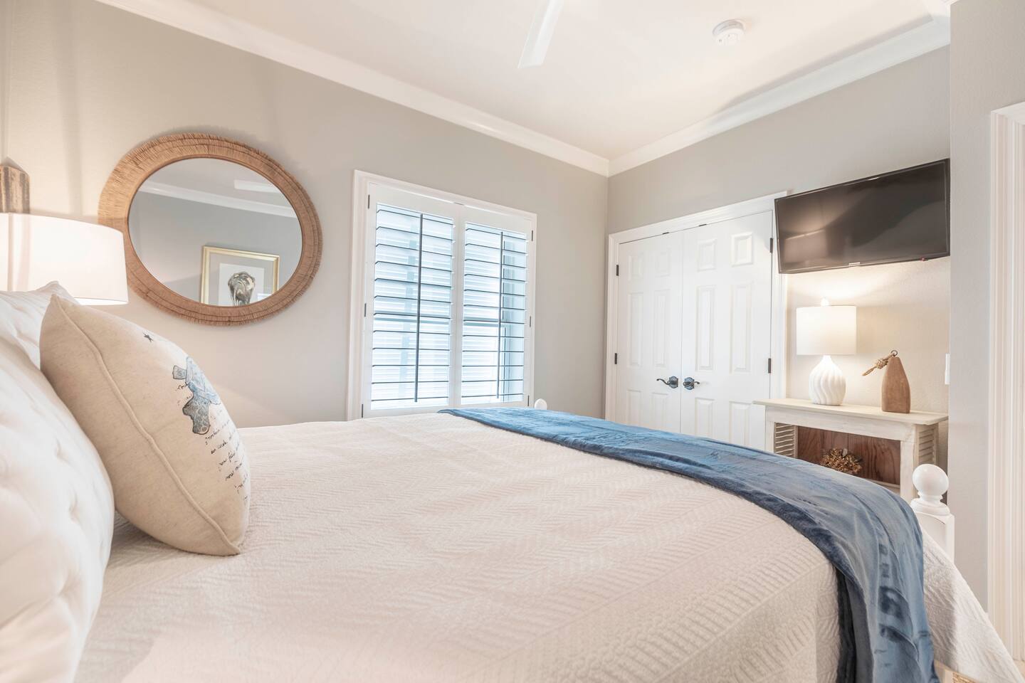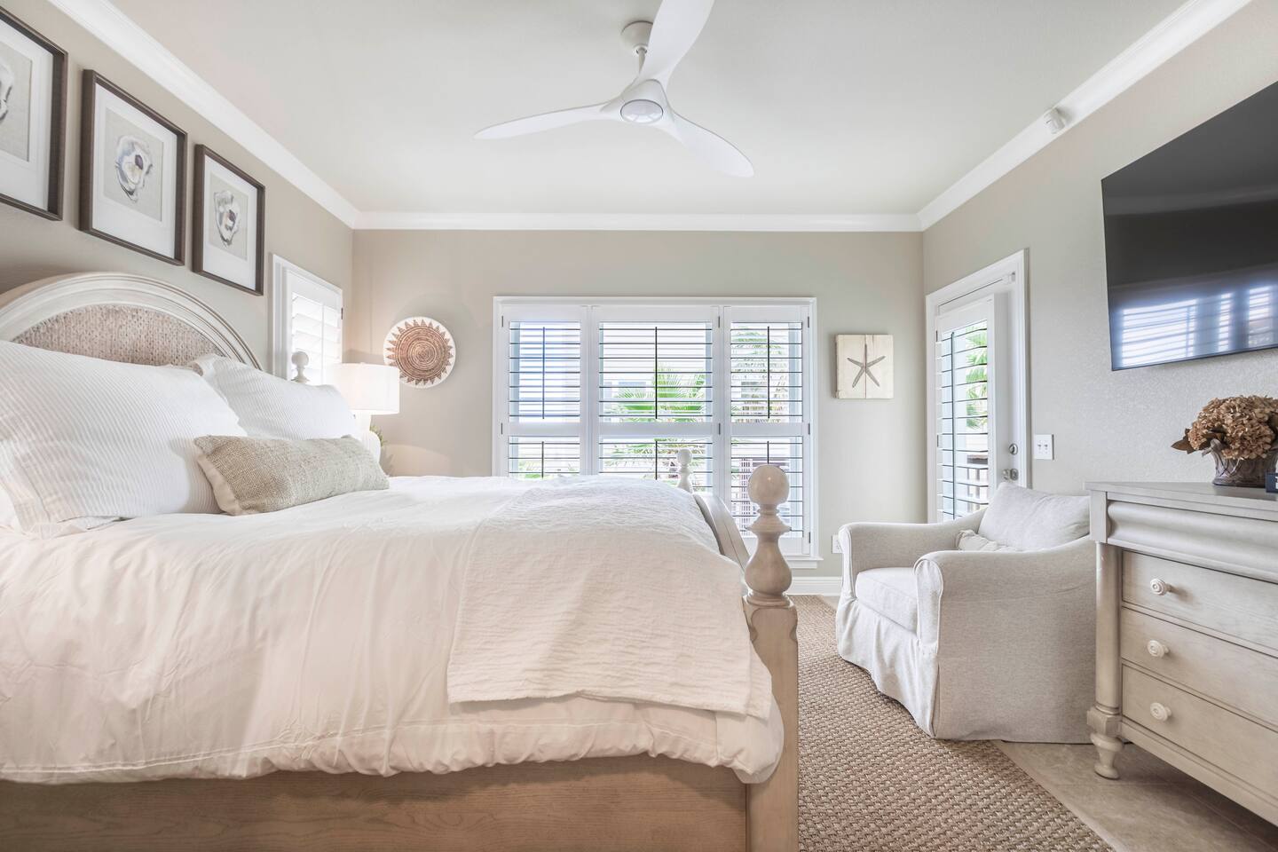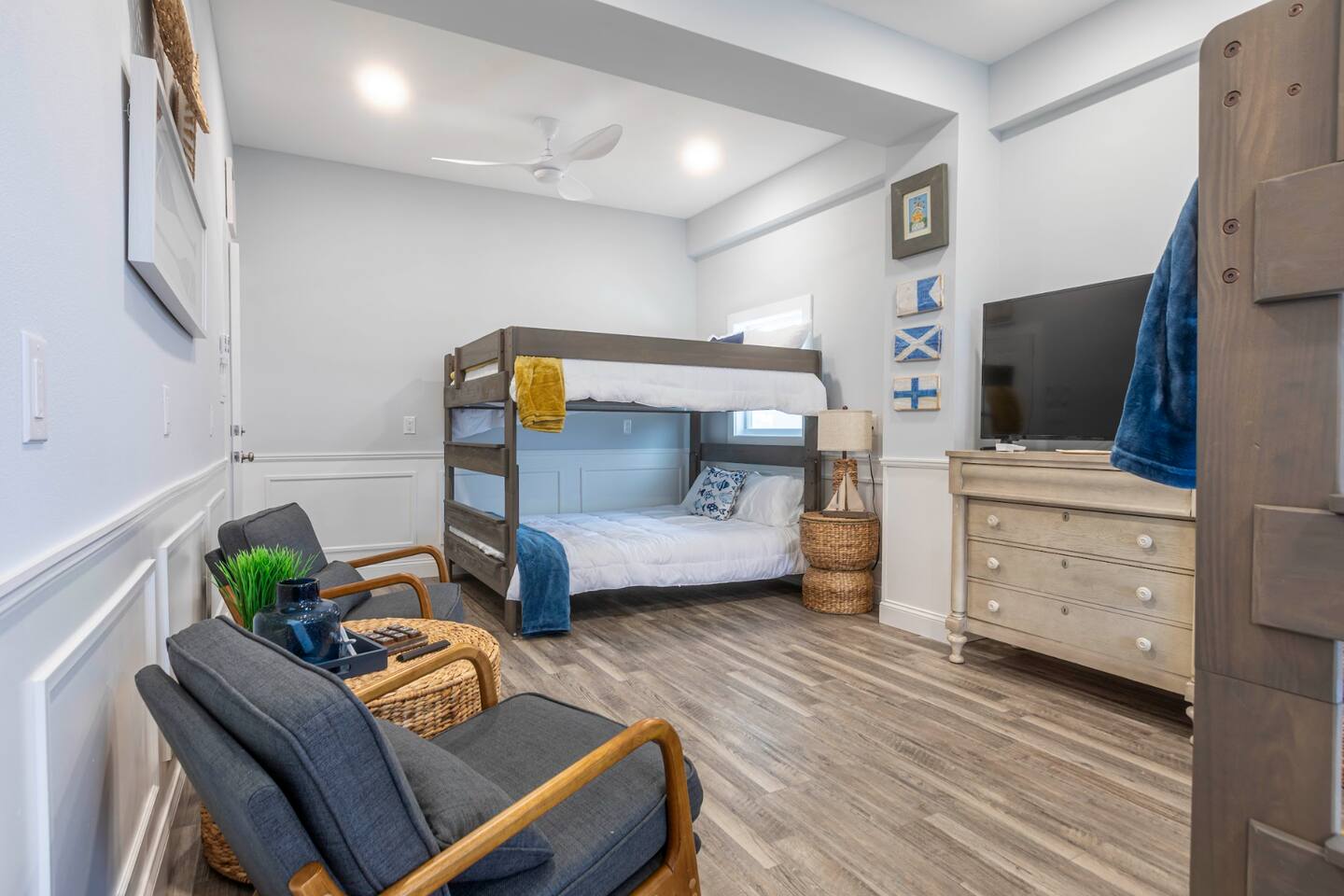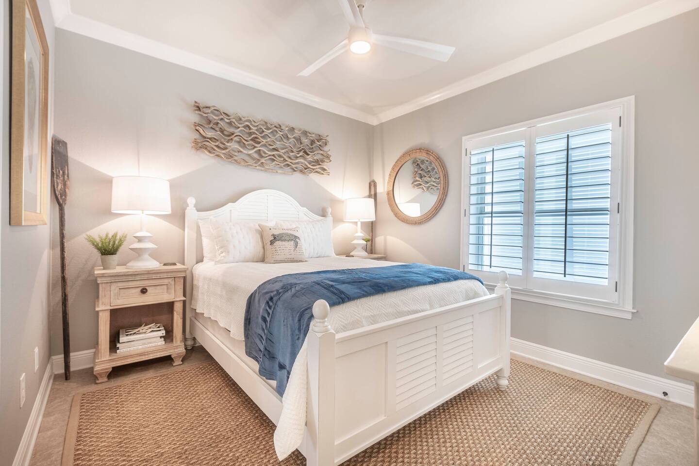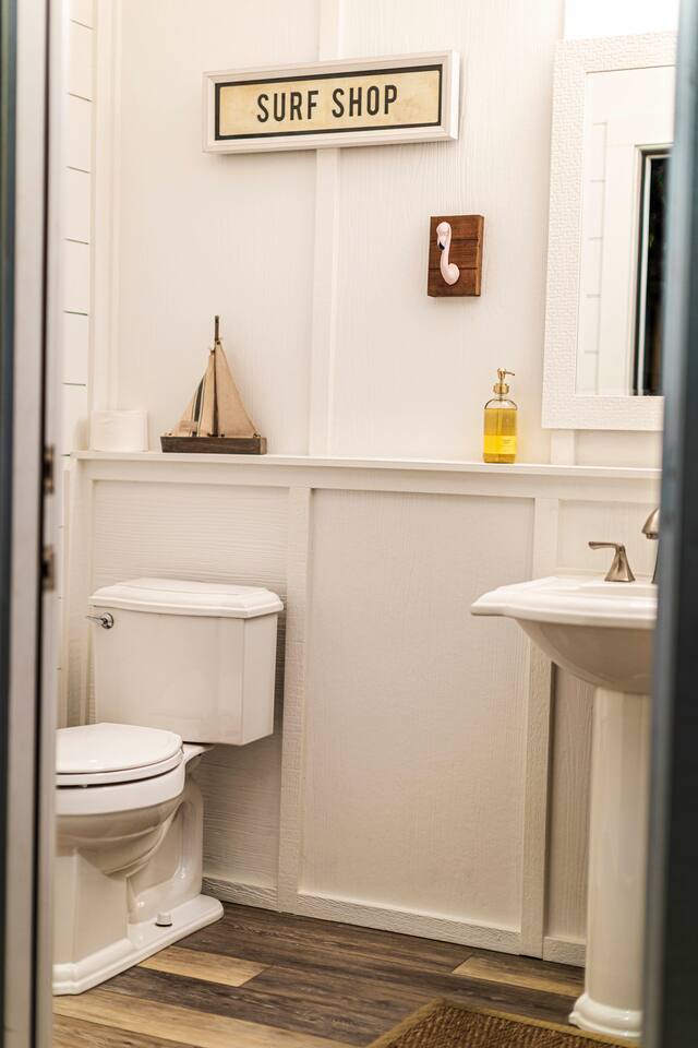 You will love our beautiful coastal home design and our gorgeous saltwater pool! Home is beautifully furnished with high end, unique coastal furniture pieces and decor inspired by and curated from both 30A as well as locally here in Pensacola. Each bedroom sleeps two and house sleeps up to 14 guests. King size pillow top mattress in the primary suite upstairs. Two other bedrooms upstairs with queen pillow top mattresses and jack-n-jill bathroom between. Queen Sleeper sofa in living room. Bunkroom downstairs with two queen over queen bunks. (Outside entrance only. No interior staircase. Entrance is under the back deck by the pool within the privacy fence. Hotel luxury 600 thread count, soft sheets and bedding. Two and a half full bathrooms upstairs and one full bath downstairs by the pool. Smart TVs so you can log in to your own accounts and watch your movies while on vacation. Various reading books, family games, cards and more throughout the home. Wifi provided. We love the house as it sits on one of the narrowest parts of the island and you can see BOTH bodies of water - Views of the Gulf out the back windows and views of the sound off the front porch. Three minute walk to the beach access and five minute walk over to the sound. This home is in the perfect location on the beach side of the island. It is just off of the main beach road, so quick to head down to restaurants and shopping. Enjoy the complementary Pensacola Beach Trolleys from Memorial Day through Labor Day that stops in front of the home and will take you up and down to all the restaurants. Or rent our 4 seater golf cart for an EXTRA FEE of 75/night. Fully stocked with all your BEACH gear! Beach chairs, paddle board, skimboards, boogie boards, beach sand toys, umbrella, beach towels and floats all available for your stay. Cornhole and spikeball for even more fun! Just bring your swimsuit! Kitchen has everything you'd need for your stay including Keurig, coffee maker and a Ninja cocktail blender, crock pot and fish fryer. Weber charcoal grill provided (bring your own charcoal). Extra drink fridge downstairs for all of your beach drinks. Washer Dryer access in the home. (bring your own detergent) Starter pack of paper towel roll, 2 rolls of toilet paper, 2 dish pods, 2 trash bags, and hand soap will be provided for your stay! We have a couple box fans in the house if you can't sleep without one. iykyk