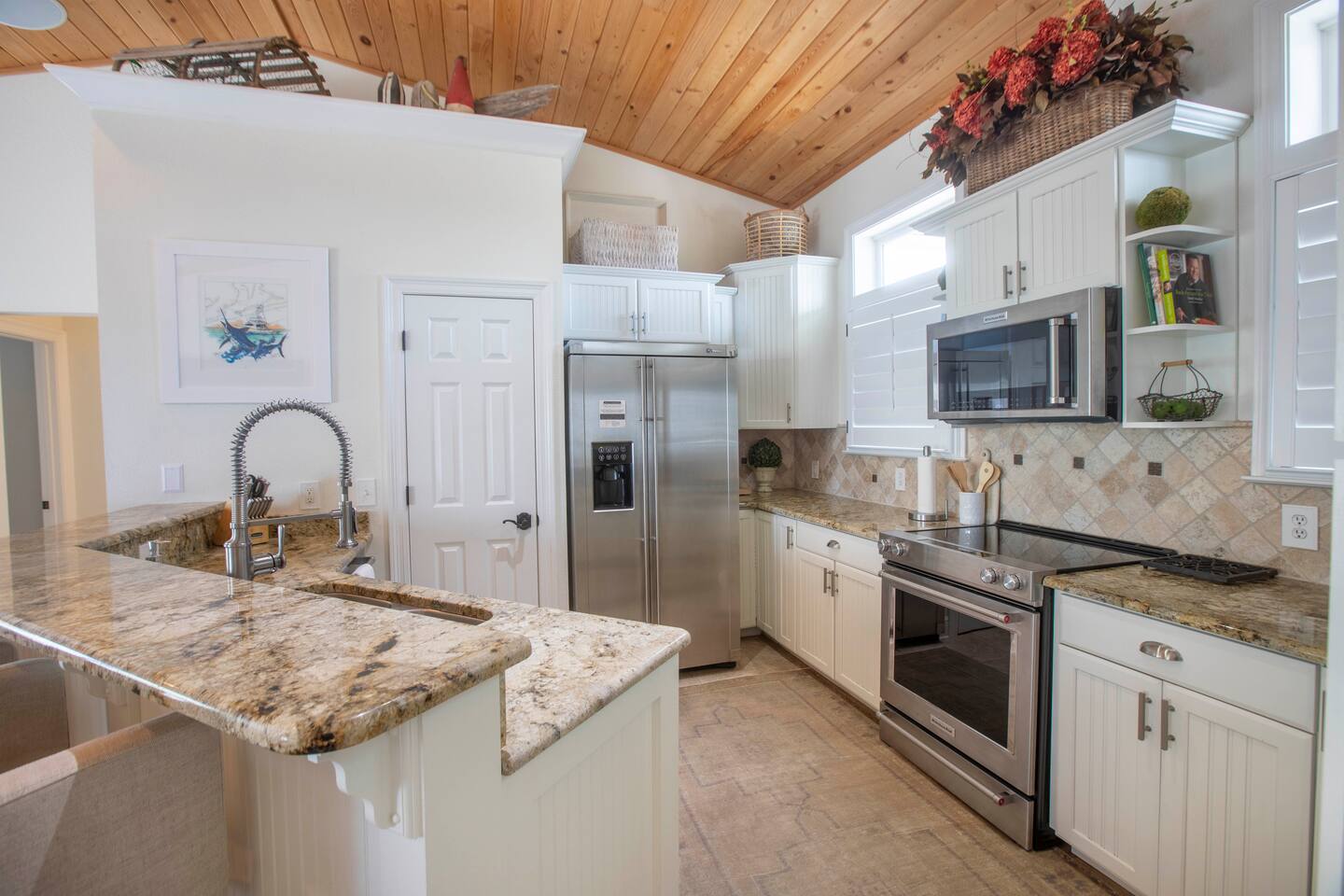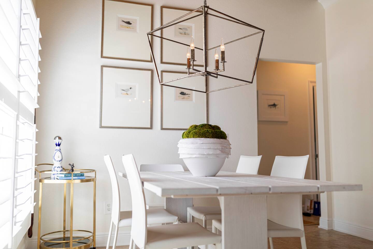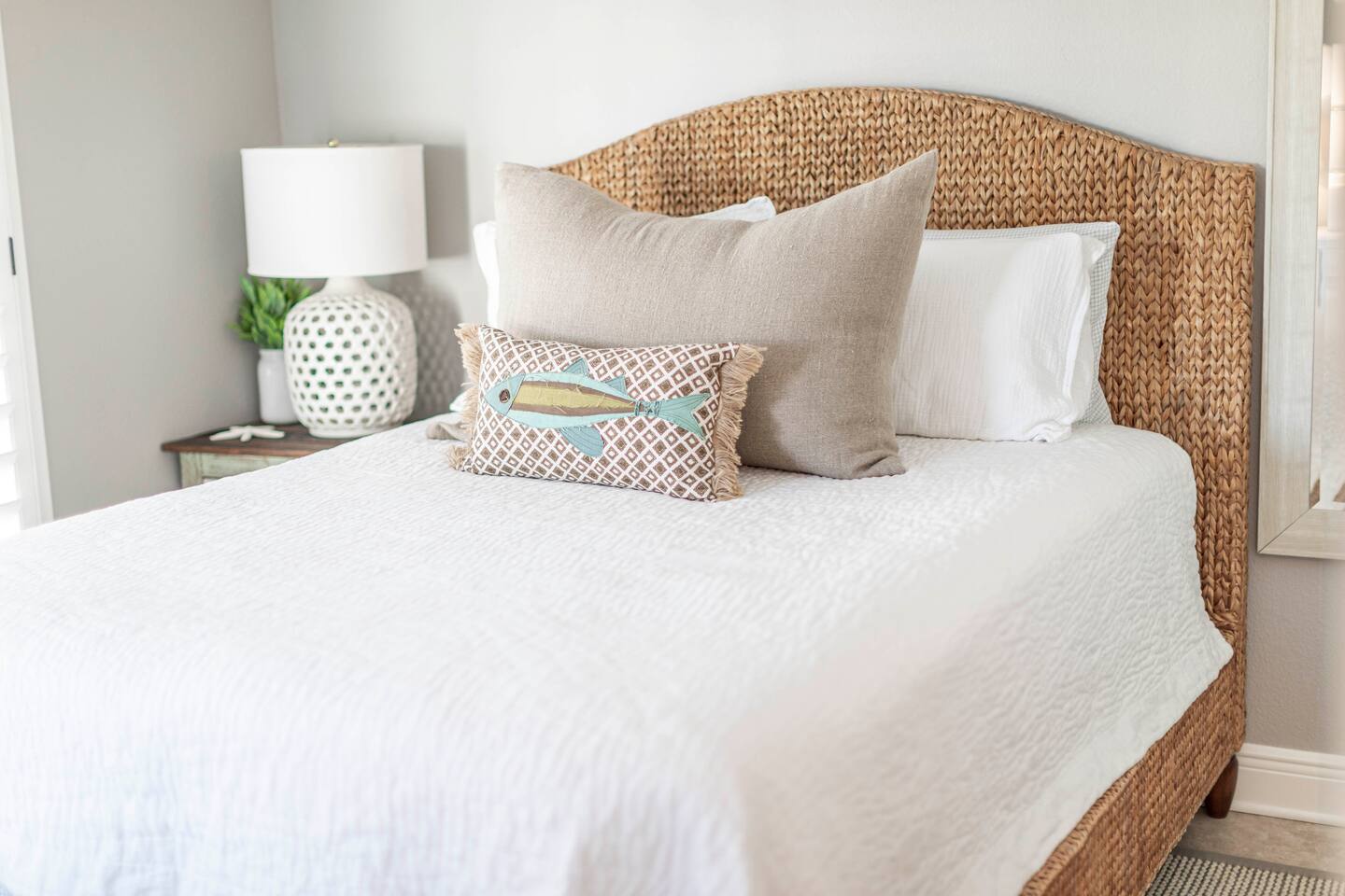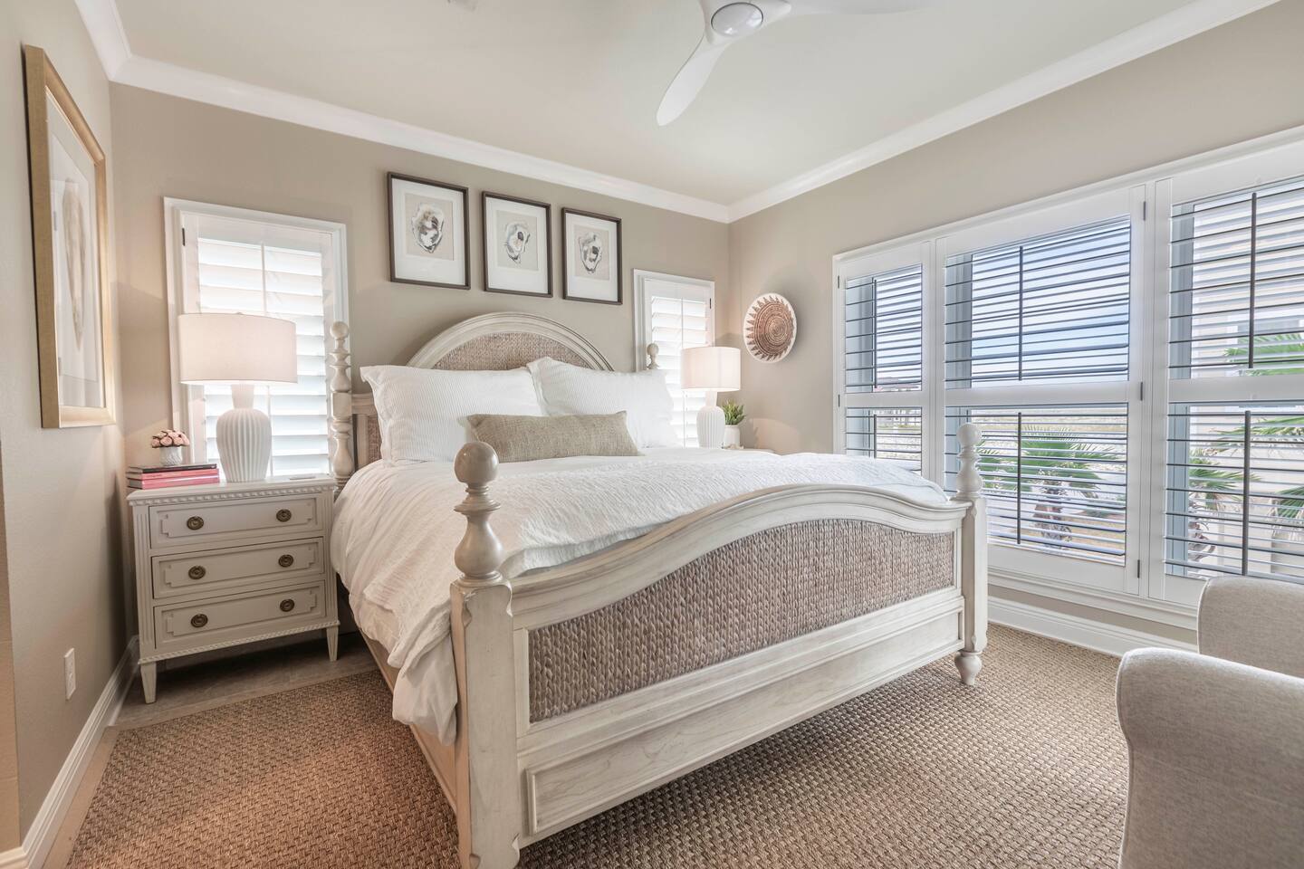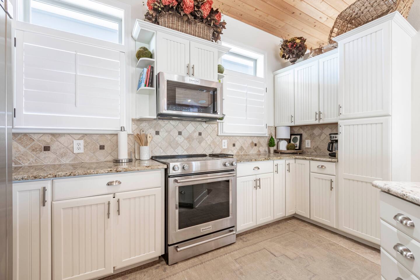 You will love our beautiful coastal home design and our gorgeous saltwater pool! Home is beautifully furnished with high end, unique coastal furniture pieces and decor inspired by and curated from both 30A as well as locally here in Pensacola. Each bedroom sleeps two and house sleeps up to 14 guests. King size pillow top mattress in the primary suite upstairs. Two other bedrooms upstairs with queen pillow top mattresses and jack-n-jill bathroom between. Queen Sleeper sofa in living room. Bunkroom downstairs with two queen over queen bunks. (Outside entrance only. No interior staircase. Entrance is under the back deck by the pool within the privacy fence. Hotel luxury 600 thread count, soft sheets and bedding. Two and a half full bathrooms upstairs and one full bath downstairs by the pool. Smart TVs so you can log in to your own accounts and watch your movies while on vacation. Various reading books, family games, cards and more throughout the home. Wifi provided. We love the house as it sits on one of the narrowest parts of the island and you can see BOTH bodies of water - Views of the Gulf out the back windows and views of the sound off the front porch. Three minute walk to the beach access and five minute walk over to the sound. This home is in the perfect location on the beach side of the island. It is just off of the main beach road, so quick to head down to restaurants and shopping. Enjoy the complementary Pensacola Beach Trolleys from Memorial Day through Labor Day that stops in front of the home and will take you up and down to all the restaurants. Or rent our 4 seater golf cart for an EXTRA FEE of 75/night. Fully stocked with all your BEACH gear! Beach chairs, paddle board, skimboards, boogie boards, beach sand toys, umbrella, beach towels and floats all available for your stay. Cornhole and spikeball for even more fun! Just bring your swimsuit! Kitchen has everything you'd need for your stay including Keurig, coffee maker and a Ninja cocktail blender, crock pot and fish fryer. Weber charcoal grill provided (bring your own charcoal). Extra drink fridge downstairs for all of your beach drinks. Washer Dryer access in the home. (bring your own detergent) Starter pack of paper towel roll, 2 rolls of toilet paper, 2 dish pods, 2 trash bags, and hand soap will be provided for your stay! We have a couple box fans in the house if you can't sleep without one. iykyk