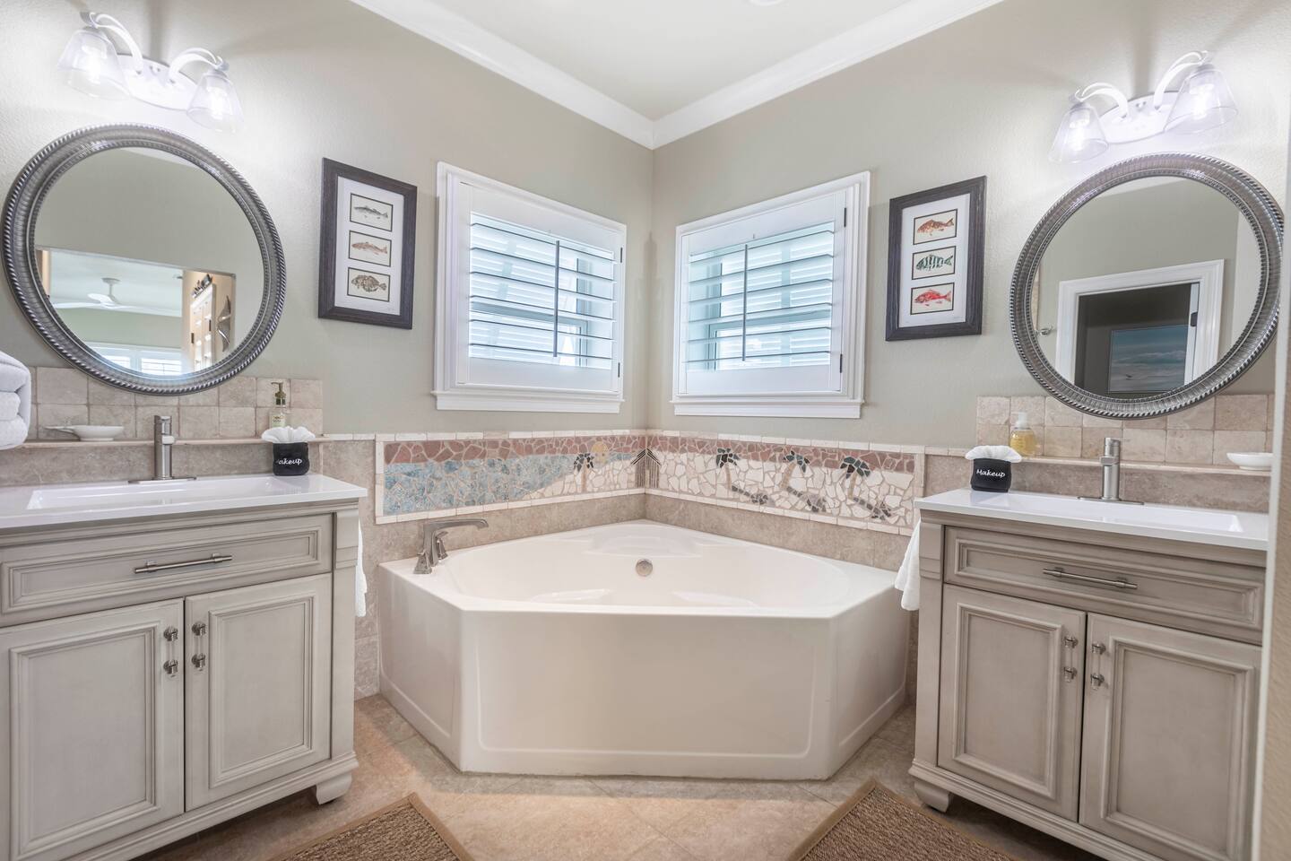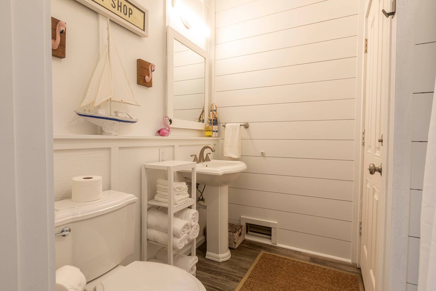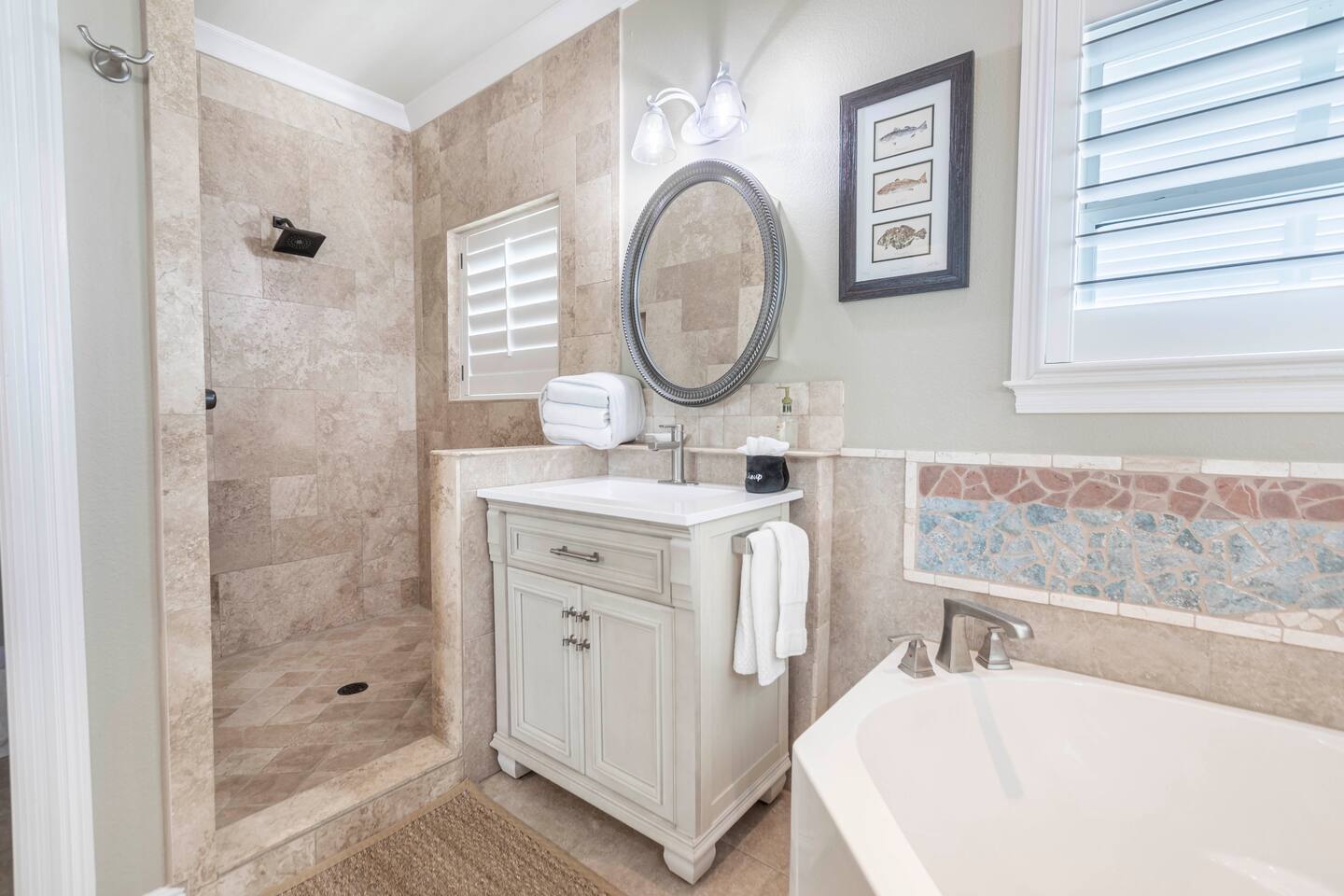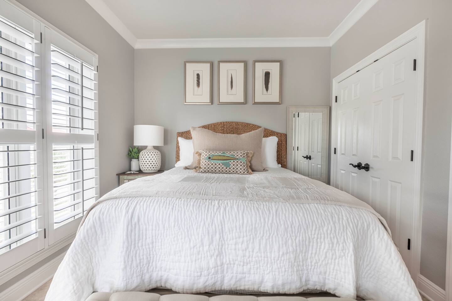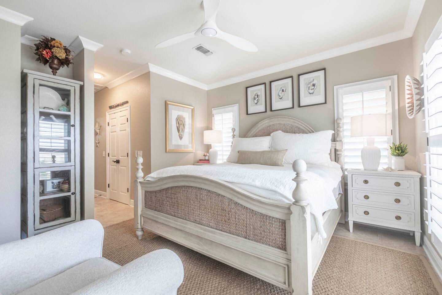 You will love our beautiful coastal home design and our gorgeous saltwater pool! Home is beautifully furnished with high end, unique coastal furniture pieces and decor inspired by and curated from both 30A as well as locally here in Pensacola. Each bedroom sleeps two and house sleeps up to 14 guests. King size pillow top mattress in the primary suite upstairs. Two other bedrooms upstairs with queen pillow top mattresses and jack-n-jill bathroom between. Queen Sleeper sofa in living room. Bunkroom downstairs with two queen over queen bunks. (Outside entrance only. No interior staircase. Entrance is under the back deck by the pool within the privacy fence. Hotel luxury 600 thread count, soft sheets and bedding. Two and a half full bathrooms upstairs and one full bath downstairs by the pool. Smart TVs so you can log in to your own accounts and watch your movies while on vacation. Various reading books, family games, cards and more throughout the home. Wifi provided. We love the house as it sits on one of the narrowest parts of the island and you can see BOTH bodies of water - Views of the Gulf out the back windows and views of the sound off the front porch. Three minute walk to the beach access and five minute walk over to the sound. This home is in the perfect location on the beach side of the island. It is just off of the main beach road, so quick to head down to restaurants and shopping. Enjoy the complementary Pensacola Beach Trolleys from Memorial Day through Labor Day that stops in front of the home and will take you up and down to all the restaurants. Or rent our 4 seater golf cart for an EXTRA FEE of 75/night. Fully stocked with all your BEACH gear! Beach chairs, paddle board, skimboards, boogie boards, beach sand toys, umbrella, beach towels and floats all available for your stay. Cornhole and spikeball for even more fun! Just bring your swimsuit! Kitchen has everything you'd need for your stay including Keurig, coffee maker and a Ninja cocktail blender, crock pot and fish fryer. Weber charcoal grill provided (bring your own charcoal). Extra drink fridge downstairs for all of your beach drinks. Washer Dryer access in the home. (bring your own detergent) Starter pack of paper towel roll, 2 rolls of toilet paper, 2 dish pods, 2 trash bags, and hand soap will be provided for your stay! We have a couple box fans in the house if you can't sleep without one. iykyk